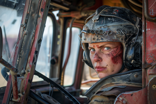 a driver of a a war rig from the mad max films. they are completely androgynous. they are covered in armor made out of bullets. giant truck. big rig. --ar 3:2 --v 6.0