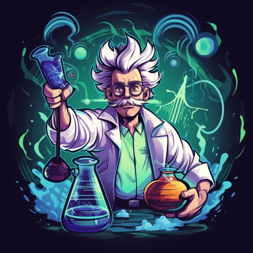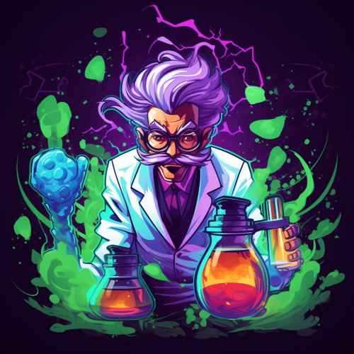 cartoon vector logo of mad scientist mixing neon liquids in Erlenmeyer Flask, laboratory with tesla coil in background, dramatic lighting, dynamic pose, celestial backdrop, code text floating in the air