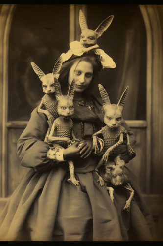 a bizarre image of a Madonna with four children creatures nursing, insect rabbit like infant creatures nursing from the Madonna, Eugene Atget and Tim Walker aesthetic, --ar 2:3