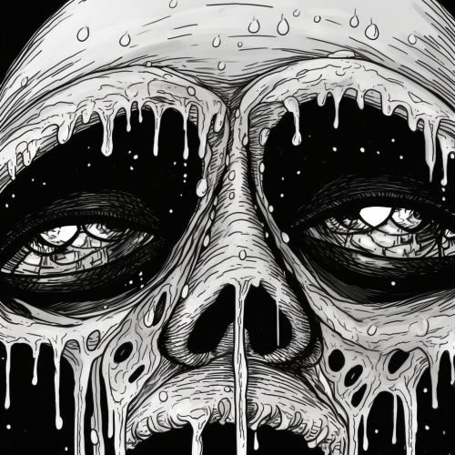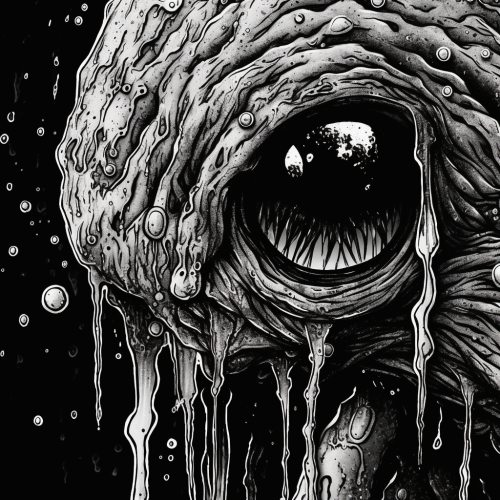 Humanoid Creature Covered in eye and dripping slime, ink pen, no color, black and white, heavy shadows, horror art, death metal art, doom metal art, heavy metal art, evil art, album cover, black metal art, comic book art, graphic novel art, digital art, vector art, --v 5.0 --s 50