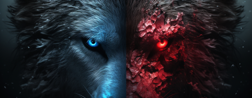 futuristic and cinematic photography, a mad wolf in the middle with half red and half blue face, amazing light, very realistics textures, skin realistic , ultra - detailed photography, immersive visual shot taken with a hasselbald professional camera --v 5.2 --ar 9:16