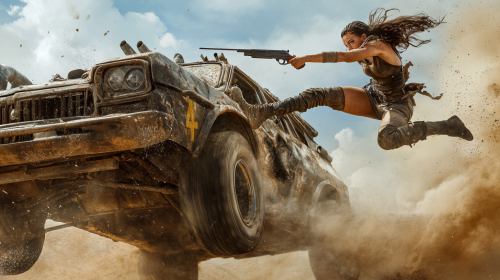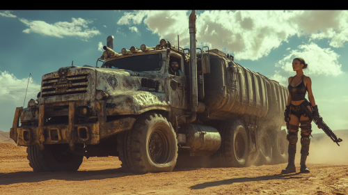 Cinematic film still, Mad Max style, Furiosa, 30s female with a shotgun standing next to a hyper-realistic, ultra-resolution depiction of a heavily armored, apocalyptic-style truck --ar 16:9