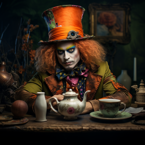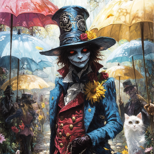 eye level photo realistic point of full body view of the character the mad hatter dressed in a steam punk blue, red soft fur jersey, a black and white twisting spiral pattern hat, yellow flowers, and the cheshire cat walking through and looking up at a grove of tall, multiple sized of umbrella forms, in an abstract pattern, translucent and opaque, embossed with a doilie pattern, many people, shadow patterns on the ground