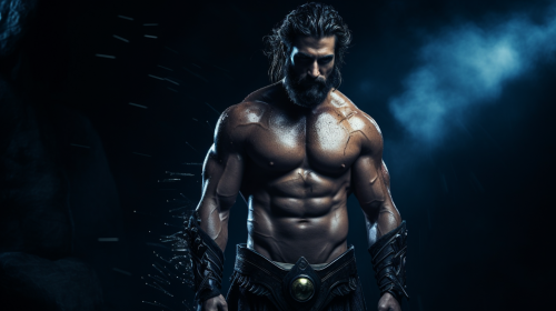 epic greek god looking mad, standing with a sword, dark background, with blue leds reflecting, --ar 16:9 --v 5.2