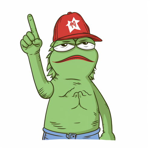 hand drawn equal symbol with the meme Pepe frog wearing maga hat standing on top --v 5.0