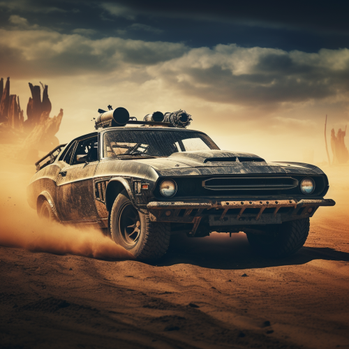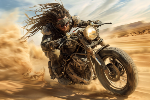 mad max universe, a motorcycle speeding through the desert. dreadlocks flying in the air behind. goggles. holding a luger. realistic, cinematic. --ar 3:2 --v 6.0