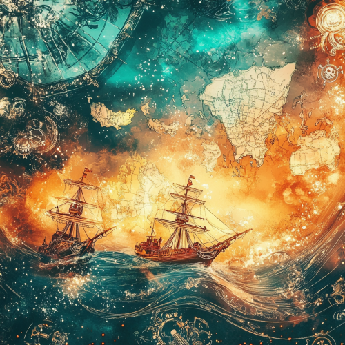 Create a dreamy and captivating advertising background for school pencil cases inspired by One Piece. The background should have a magazine-style aesthetic with a fantastical and adventurous theme. Include elements such as pirate ships, treasure maps, and ocean waves in a vibrant, whimsical style. Use rich colors and light effects to create an enchanting and imaginative scene. Ensure there is a clear space in the center for adding images of the pencil cases. The design should be striking and visually appealing, making it perfect for a magazine-style ad. Specific details to include: Style: Dreamy magazine-style with a fantastical and adventurous theme Design elements: Pirate ships, treasure maps, ocean waves Colors: Rich and vibrant Ambiance: Enchanting, imaginative, whimsical Clear central area: To add the pencil case images