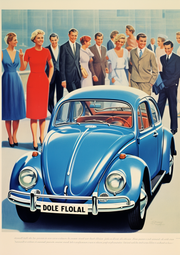 a 1960s magazine advertisement, the car should be blue, for the Volkswagen beetle, with people, and words --ar 10:14