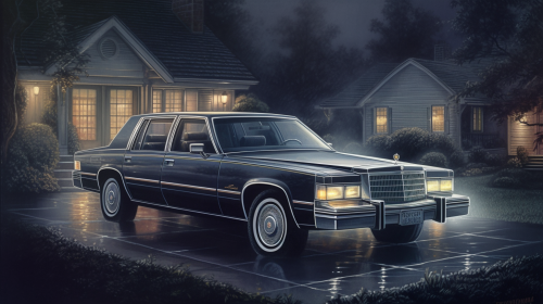 a 1980s magazine ad for a cadillac, ultra realism, peaceful lighting suburban neighborhood at dusk --ar 16:9 --v 5.0 --s 250