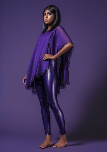 An impossibly Realistic modern photograph of a Malay-Singaporean supermodel in stretchable shiny dark purple leggings and short violet kaftan, as shot using MPC-2610 BURANO Cinema Line Full-frame 8.6K Camera, maximalism, --no chinese, --style raw --ar 7:10 --v 6.0 --stylize 0