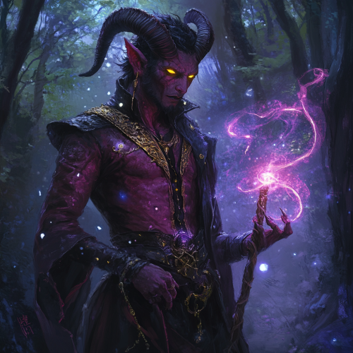 A tall, sleek tiefling mage with crimson skin, curled black horns, and yellow eyes that glow with arcane power. He stands in a twilight forest clearing, holding a glowing staff with a swirling magical aura around him. The atmosphere is dark and mysterious, with deep purples and blues dominating the scene. The art should capture the dramatic, magical essence of D&D, with detailed textures, strong contrasts, and a sense of looming danger, immersing the viewer in a world of high fantasy.