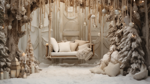 a ethereal christmas eoutdoor with neutral greens and tan colors, with a swing hanging from a large tree limb --ar 16:9