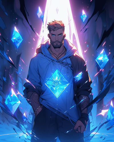 35 year old man with short hair looking like actor Sean harris,standing in front of a large glowing sapphire crystal, surrounded by electricity, in a crystal desert, electric arc, neoncore, Sapphire Blue and Electric Blue and hints of Neon Green, clean line art, unusual angle, webtoon, comic book style --ar 4:5 --s 250 --niji 5