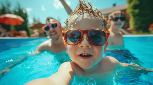 realistic photo, baby with sunglasses, taking a selfy with his friends in the pool, summer, house with garden, commercial photo, realistic photography style, no blurry image, high detail, super high quality, 8K, --ar 16:9 --v 6.0