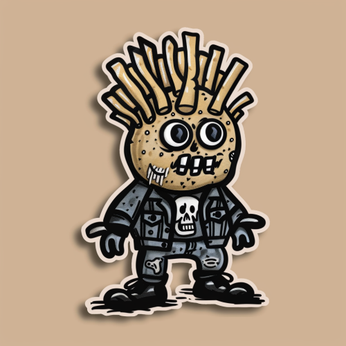 A sticker of a cartoon potato, in Sailor Jerry style art. The potato is ultra cool. His hair is in the shape of french-fries. He is wearing a denim jacket, and has a tattoo on his arm of a skull and crossbones.