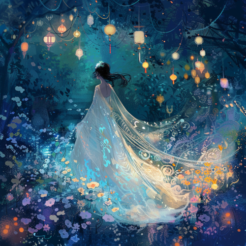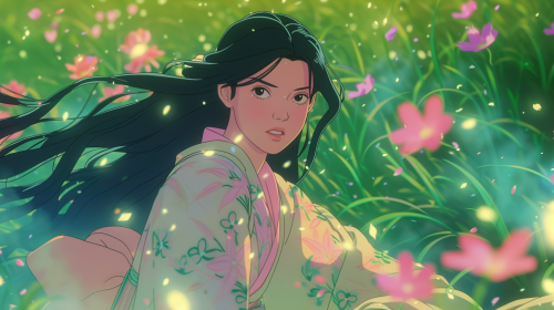 A stylized anime version of Kim Kardashian in a Ghibli-inspired fantasy world, surrounded by magical creatures and spirits in a lush green meadow. The light is soft and ethereal, with colorful flowers dotting the landscape. Her outfit features flowing silks and delicate embroidery, enhancing the fairytale atmosphere. Created Using: hand-drawn animation techniques, Ghibli-inspired magical creatures, hd quality, soft gradient lighting, detailed fabric textures, glowing ambient lighting, pastel color palette --ar 16:9 --v 6.0