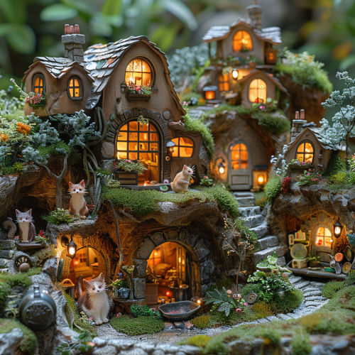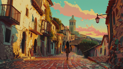 Kim Kardashian as a Studio Ghibli-style protagonist, walking through a fantastical village with cobblestone streets and whimsical architecture, her expression determined but serene. The colors are vibrant, with the sun low in the sky casting a golden glow over the scene. Light bounces off the buildings, creating playful reflections. Created Using: hand-drawn animation techniques, Studio Ghibli-inspired architecture, cinematic framing, warm lighting, hd quality, vibrant color palette, soft shadows, painterly textures --ar 16:9 --v 6.0