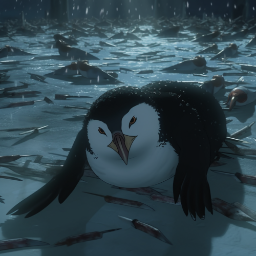 DVD screengrab, 2010 Studio Ghibli anime movie, one single 25 - year - old male hero wielding a sword who just defeated and destroyed a penguin in a battle. show the penguin laying down with eyes closed. character looking to the left with left eye slightly higher than right eye