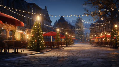 Eine fröhliche Gruppe von Schülern macht einen Ausflug auf ein eisstockschießenbahn und spielt eisstockschießen, auf einem traditionellen europäischen Weihnachtsmarkt voller Holzstände, die mit festlichen Lichtern und Dekorationen geschmückt sind; Die Schüler sind warm für den Winter gekleidet, lächeln, halten Festtagsleckereien in der Hand und spielen eisstockschießen. Der Schnee fällt sanft und schafft eine magische Atmosphäre. Die Szene fängt mit leuchtenden Farben und warmer Beleuchtung den Geist der Weihnachtszeit