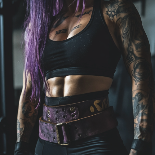 product photo, closeup shot of muscular girl wearing leather weight lifting belt, 10mm, focus on belt, at a gym, she has purple hair and some tattoos, doing squat, dark setting, dark aesthetic, gymcore --s 50