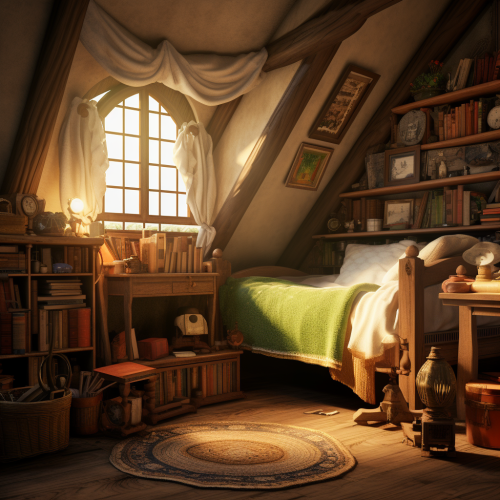 a reading corner in a bedroom. style of howl’s bedroom from howl’s moving castle, photorealistic, arcane