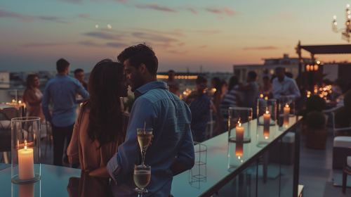 a mid 30 years old couple enjoying a cocktail loung close to a glass railing balcony on a rooftop bar at dusk. Add people in the background and some baroque chandeliers with self stands and candles. --ar 16:9 --v 6.0