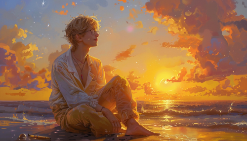 Create a highly detailed, 8K, realistic yet Ghibli-inspired drawing of a muscular blond young man with glasses, sitting quietly on the beach. He is gazing at a breathtaking sunset over the ocean, wearing clothes in vibrant shades of intense yellow, white, and blue. The scene is calm and serene, with soft waves gently lapping at the shore and a few gentle clouds in the sky. The sunset’s colors blend from warm oranges to soft purples and blues, and a few stars begin to twinkle as night approaches. The atmosphere is peaceful and transcendent, evoking thoughts of the future and hope for a better tomorrow. The landscape, with its lush and magical feel, captures the Ghibli vibe, with a focus on simplicity and deep reflection, while the colors and lighting emphasize the serene beauty of the moment. --ar 7:4 --s 250 --v 6.0
