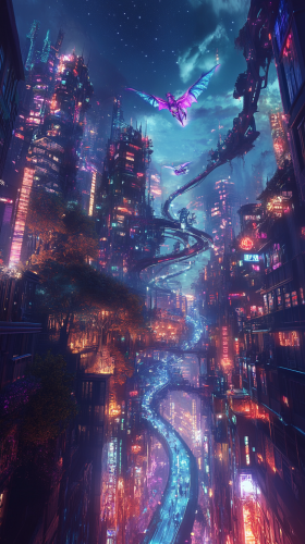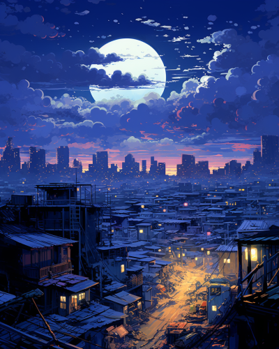 Bangkok at night, realistic and cinematic view, no moon, with high buildings background, in the style of Studio Ghibli, by Miyazaki, using yellows and blues with hint of warm appeal --ar 4:5