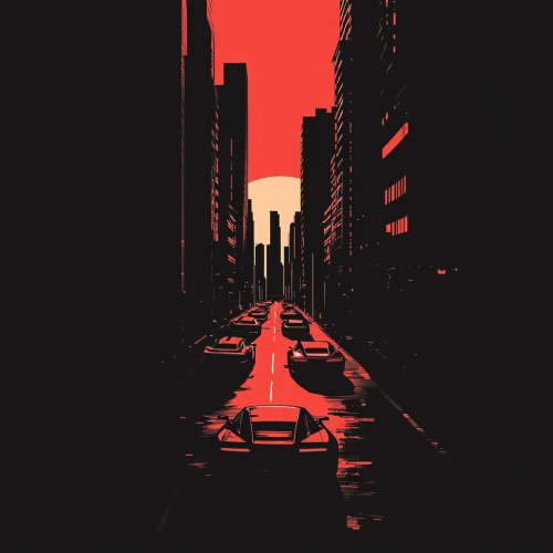 minimalist vector illustration of a city street, perspective view at dusk, silhouette of modified widebody cars racing, on black background, tall rectangle