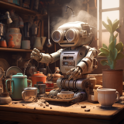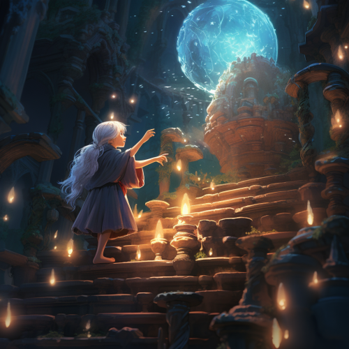 Ghibli Style, a little girl with a cloak stairs adoringly as an old wizard conjures sparkly spells over a bubbling cauldron