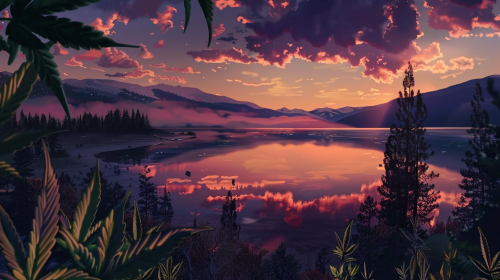 stunning landscape of colorful paradise sunset lake tahoe , cannabis field ,cinematic, cartoon 2d video game 90's --ar 16:9
