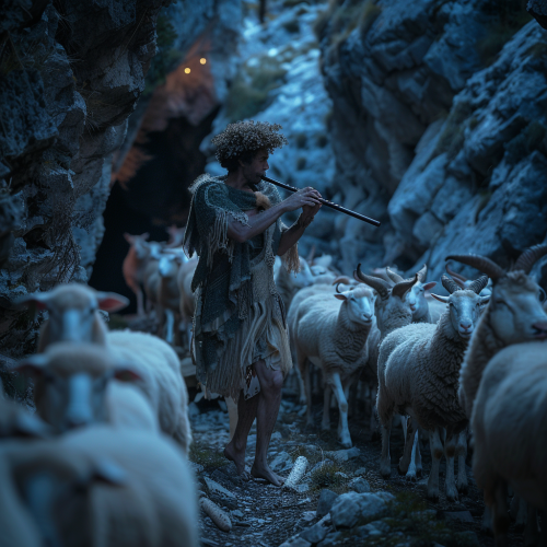 hyper realistic photo whith a canon EOS R5 Mirrorless camera, taken from a distance of 35 meters with low angle photography style, of a faun walking backwords leading the herd, playing his flute with enthusiatic energy to a sheep herd who tries to move the head in a dancing style, following him to a cave, whith the dusk of the day, and a apple tree as background