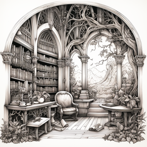 coloring pages, fantasy enchanted library coloring pages, a magical library interior, in the style of realistic hyper-detailed, realistic pencil sketch, ethereal, i can't believe how beautiful this is, soft and airy compositions, realism, fantasy elements, delicate use of line --niji 5 --ar 100:129
