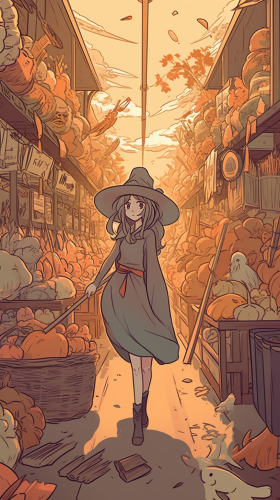 A young apprentice witch shopping in a magical kingdom's marketplace, holding her broom. The illustration has clean, sharp lines and a flat color palette, similar to the style of Hisashi Eguchi, emphasizing simplicity and elegance. The marketplace is whimsical and colorful, filled with magical items, while the character's expression and pose are light, casual, and charming, capturing the bright, modern, and minimalist aesthetic --ar 9:16 --v 5.0