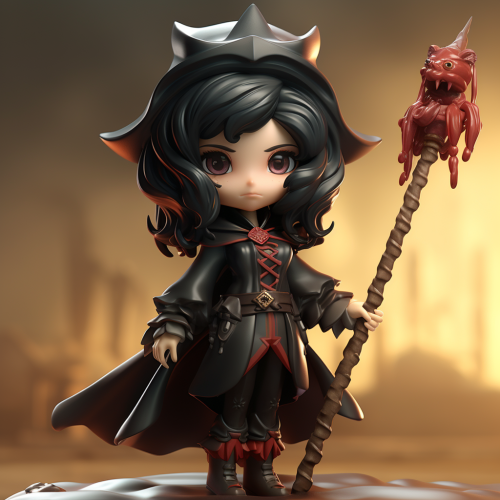 cute witch with black hair red eyes, wearing traveling cloak and tight long trousers, carrying a staff. ar 1:1