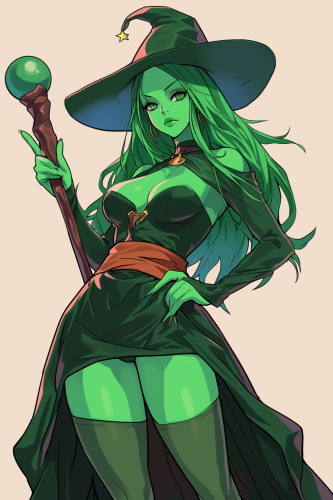 Green Skinned Witch, full body, glamorous pin-ups, ultra realistic, highly detailed, Style of 90s Anime, --ar 2:3 --s 50 --niji 6