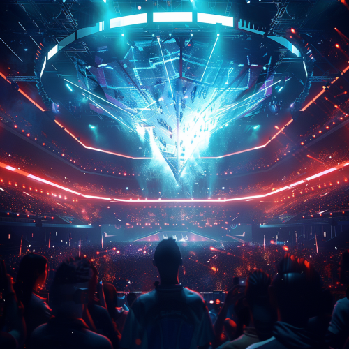 The image suggests a magical shape, inside an arena with a large enthusiastic crowd cheering on their favorite esport-team. the arena has a thick atmosphere of haze, with lights scanning across the room. Focus on the magical shape, the magical shape is the star of the show. The magical shape is made out of shapes never seen before, unimaginable by human minds. hyper realistic, hyper detailed --ar 16:9 --v 6.0