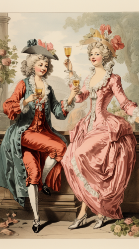 picture in the 1700s where2 of nobility are wearing the fashions of the time , cheering wine cups and celebrating --ar 9:16 --style raw
