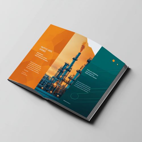 brand book template for industrial crewing brand. The main color is orange HEX: #E8864 and secondary color is teal blue. We can se different industries such as energy, oil extraction, naval technicians