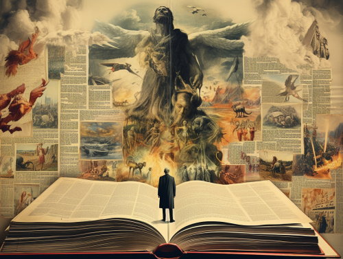 Collage of old cut out pictures of the book of revelation, template --ar 4:3 --v 5.2