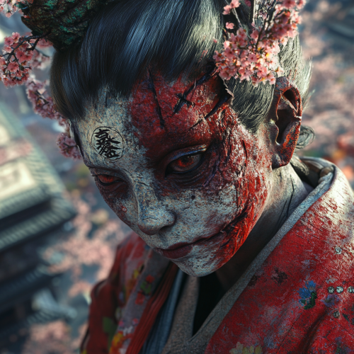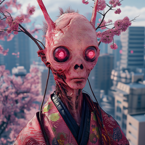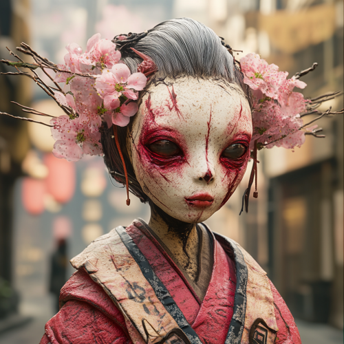 Japanese space alien Yokai, Cherry Blossam fairy,Edo period, Rough cityscape in the background,seriously injured face, Shooting below the neck.,Unreal Engine, Super-Resolution, Ray Tracing, high resolution photography, 4k, studio photo, elegant--ar 3:2