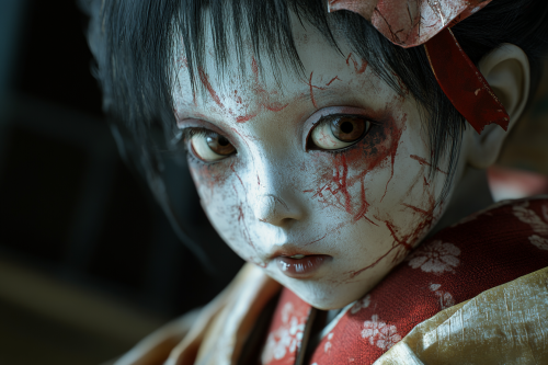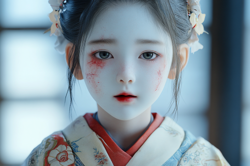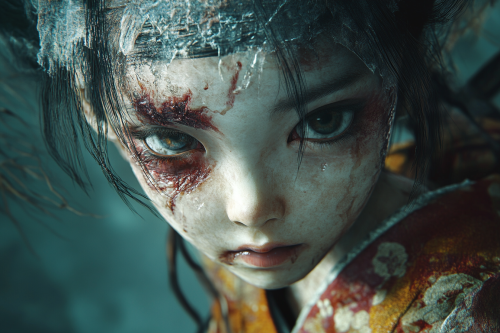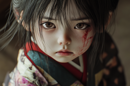 Japanese Beautiful Child Yokai, Edo period, seriously injured face, Unreal Engine, Super-Resolution, Ray Tracing, high resolution photography, 4k, studio photo, elegant, long shot, wide field of view --ar 3:2