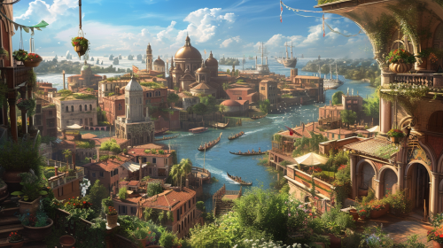 A panoramic view of a fantasy city resembling a blend of Florence and Venice during the Renaissance period. The city is bustling with activity, showcasing a rich tapestry of architecture, including grand palaces, ornate domes, and intricate canal systems. Lush gardens and greenery are interspersed throughout the city, with vines crawling up the sides of buildings and hanging pots and planters adorning the streets. The skyline is dotted with majestic towers and spires, and the bustling docks are visible in the background, filled with ships of various sizes. The overall atmosphere is vibrant and lively, capturing the essence of a thriving, prosperous city in a fantasy setting. --ar 16:9 --s 50 --v 6.0