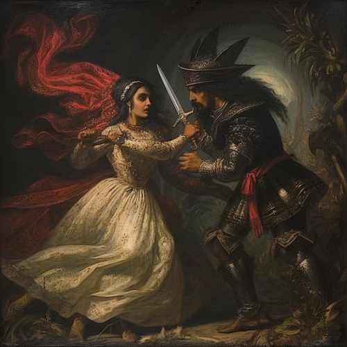 A fantasy battle between two groups of warriors. One side is wearing armor that crosses Roman designs with ancient Mongolian designs, with lots of gilding and colors. The other side are dressed in traditional English and Germanic knight’s armor. Dungeon and Dragons art, fantasy battle