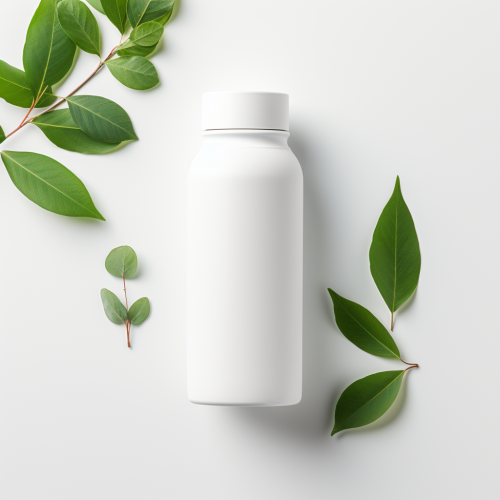 Mockup empty, a blank supplement bottle, on a clean white background, with leaf behind