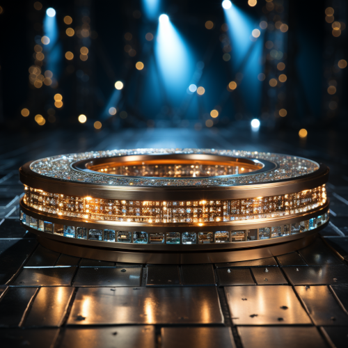 a circular stage made of gold and diamonds, yelloy and blue background, bright spotlights, realistic photography, emphasis on realism and detail, colorful --s 750