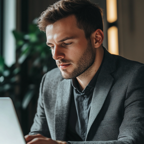 Generate a photorealistic version of A photorealistic scene of a professional interview setting, with a confident candidate sitting across from an interviewer. The background should be in light grey color, and the atmosphere should be formal and focused, capturing the essence of answering common interview questions. --ar 1:1 --quality .5
