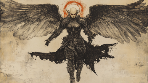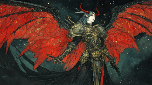 illustrated manuscript, female fallen seraphim angel wearing heavy dark armor, six large red wings, halo of fire, long horns, pale skin, flying in night sky --ar 16:9