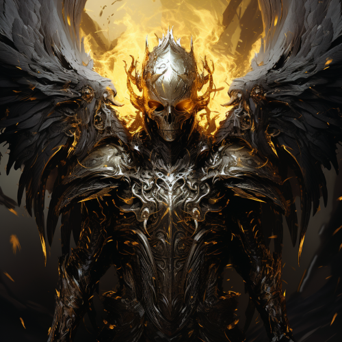 Golden-skull-headed angel, it has dark wings, gray short hair, black armor, he is in the underworld