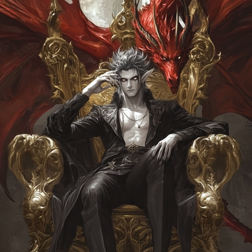 graz'zt with gray skin and black hair and white eyes, six fingers, handsome sitting on a throne of gold with his pet large demonic red dragon behind him